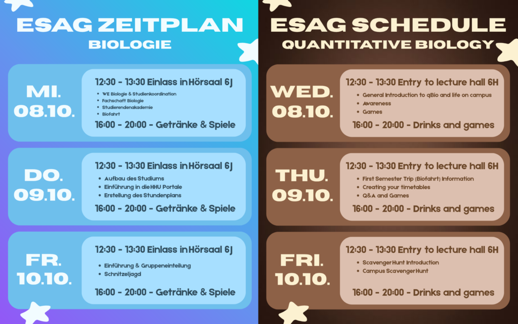 Hier findet ihr die Zeitpläne für die diesjährige Erstiwoche, jeweils für den B. Sc. Biologie und Quantitative Biology.
