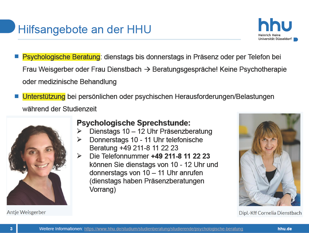 Es werden zunächst generell Informationen über den Ablauf des Studiums sowie die Modulwahlen als auch die Uni-Plattformen vermittelt. Auslandsaufenthalte, Jobmöglichkeiten neben dem Studium, das Wissenschaftszeitgesetz und mentale Gesundheit mit dem Fokus auf stressfreies studieren stellen wichtige Themen im Tutorium dar.